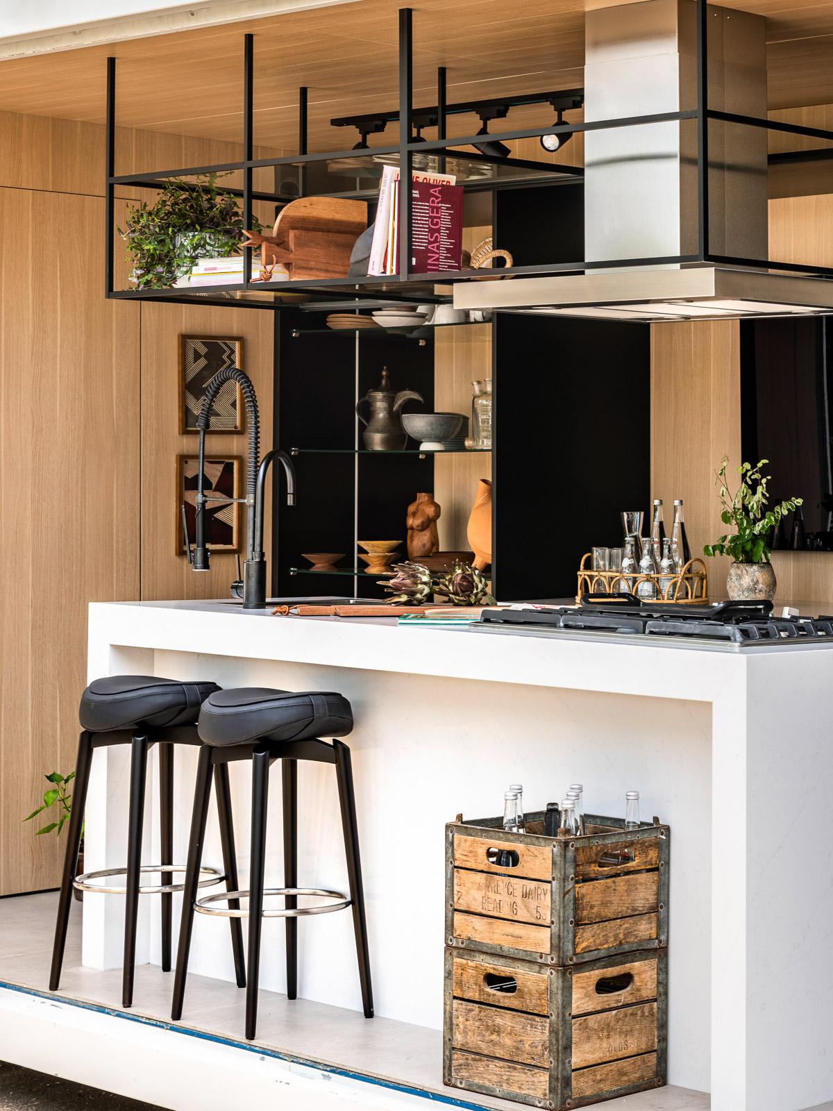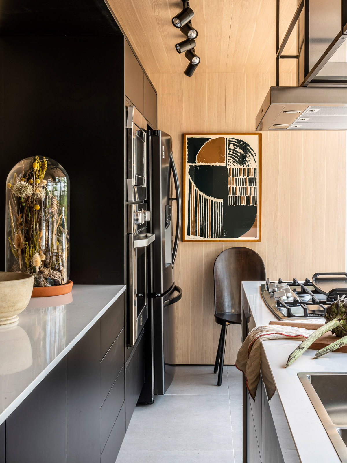 Em um ambiente compacto e com design moderno, projetado para uma família tradicional que preza pelo conforto e comunhão, a madeira em carvalho americano nas paredes transmite aconchego e praticidade na limpeza. O piso em porcelanato remete ao cimento queimado, fortificando a essência e elegância do local. Protagonista do projeto, a ilha central em Dekton é a grande responsável pela integração e otimização do espaço. Sem bloquear a visão, ela permite uma melhor interação e ainda tem a função de bancada de apoio para refeições e reuniões rápidas. Para completar, acima estão prateleiras de vidro estruturadas em aço carbono, que além de serem ideais para guardar temperos e objetos, também trazem um ar de modernidade. O toque final fica por conta do design contemporâneo das banquetas.