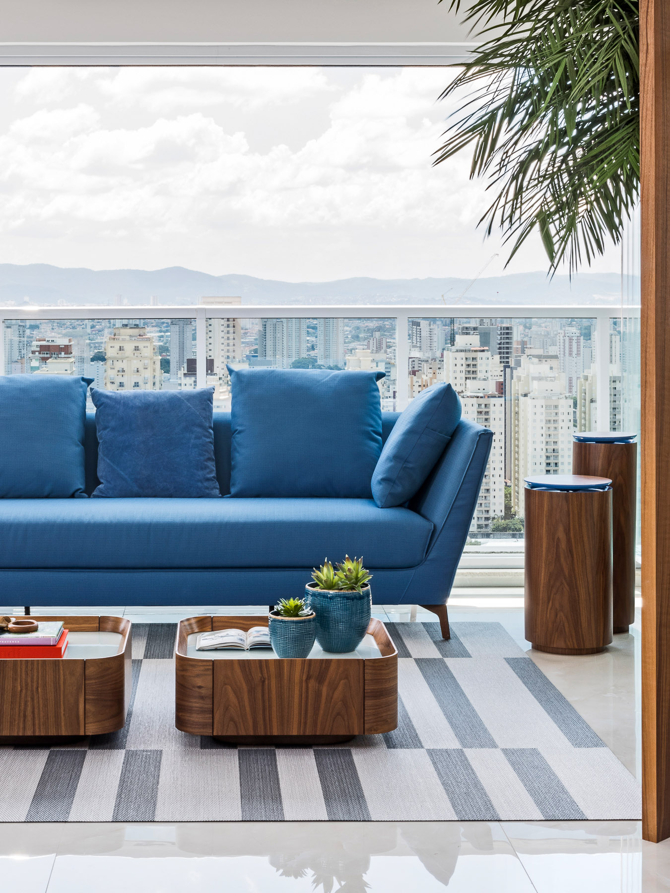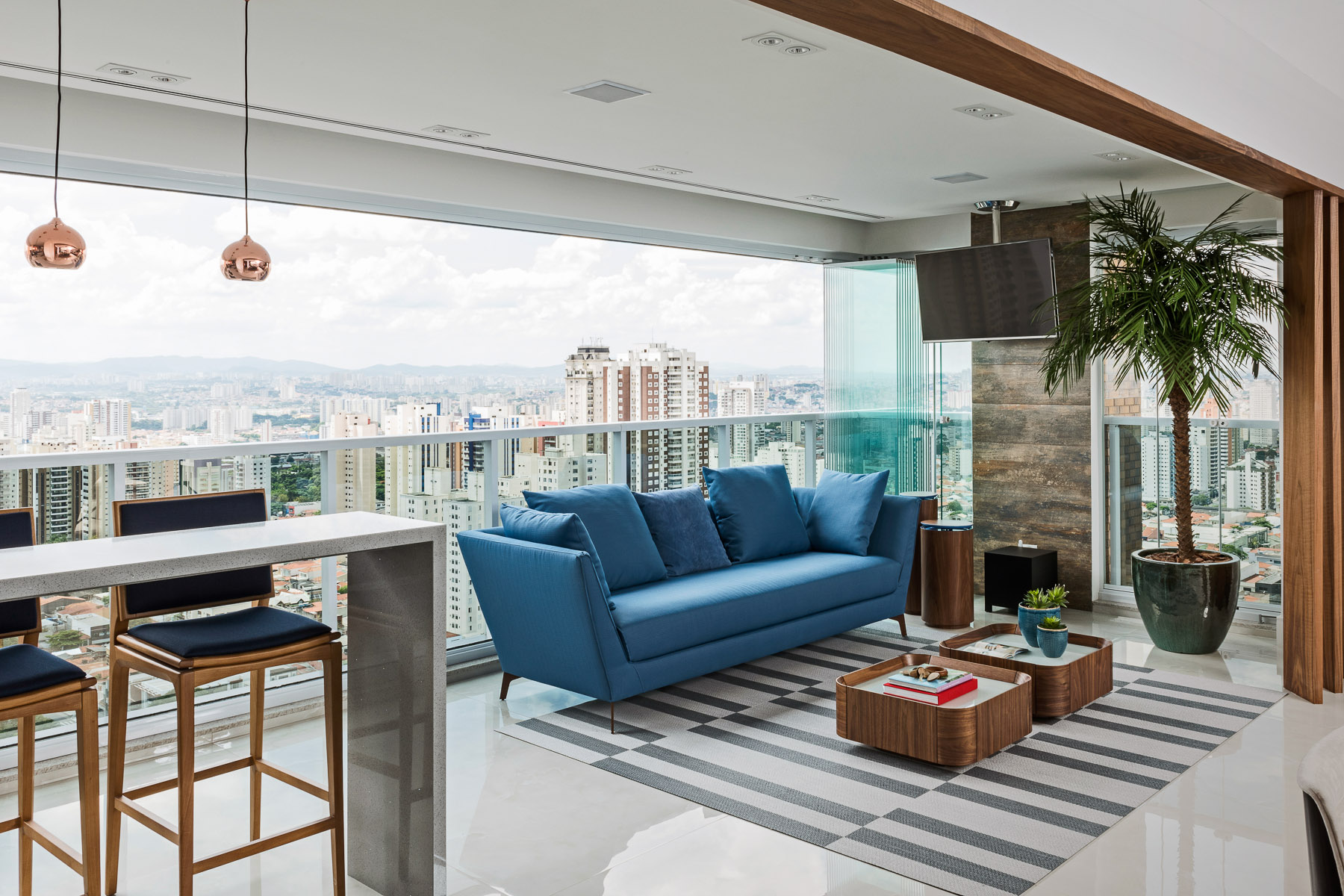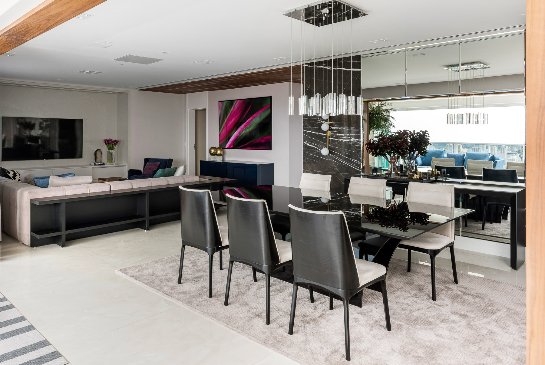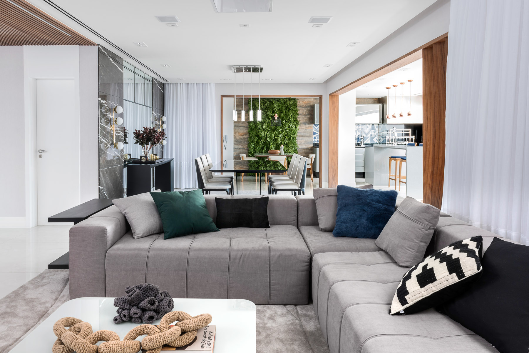 O projeto desse apartamento foi pensado para toda a família. O living é um dos principais ambientes do apartamento e foi projetado em tons neutros e claros em sua maioria, com toque de cor em alguns móveis e detalhes que trazem leveza e deixam o ambiente mais alegre. O terraço integrado ao living tem abundância em madeira nogueira tornando o ambiente sútil. O painel vertical com vegetação deixa o ambiente mais vivo.