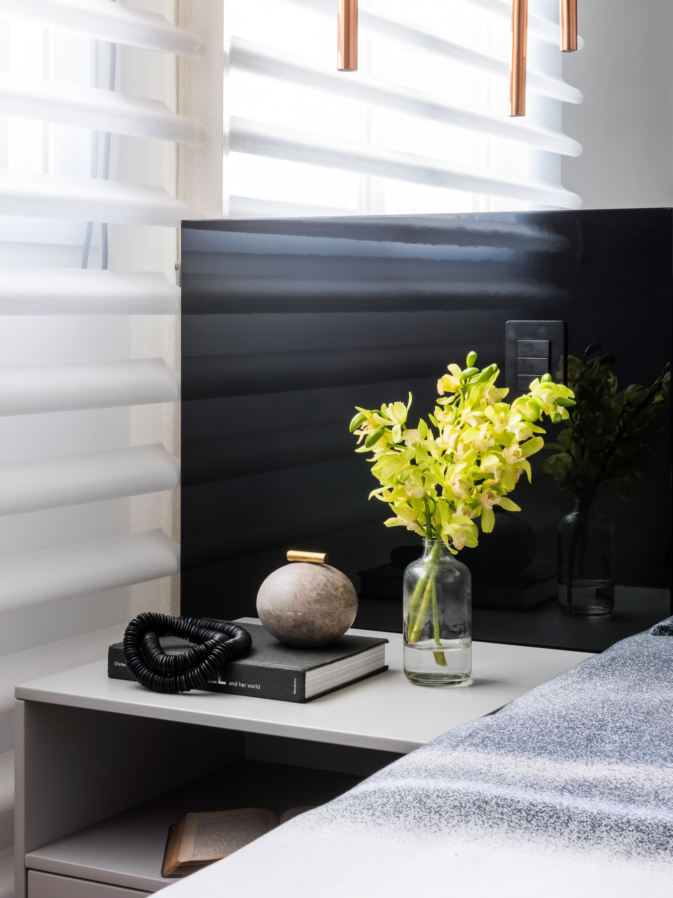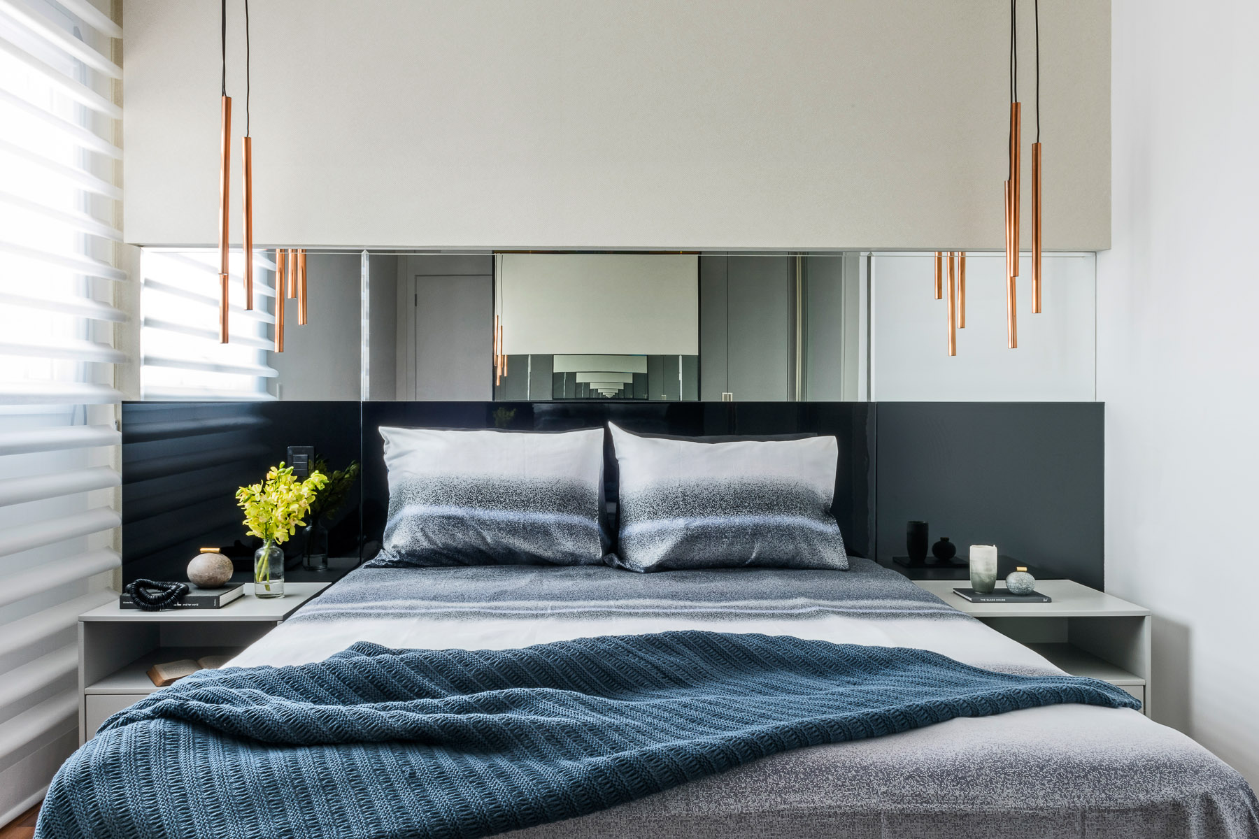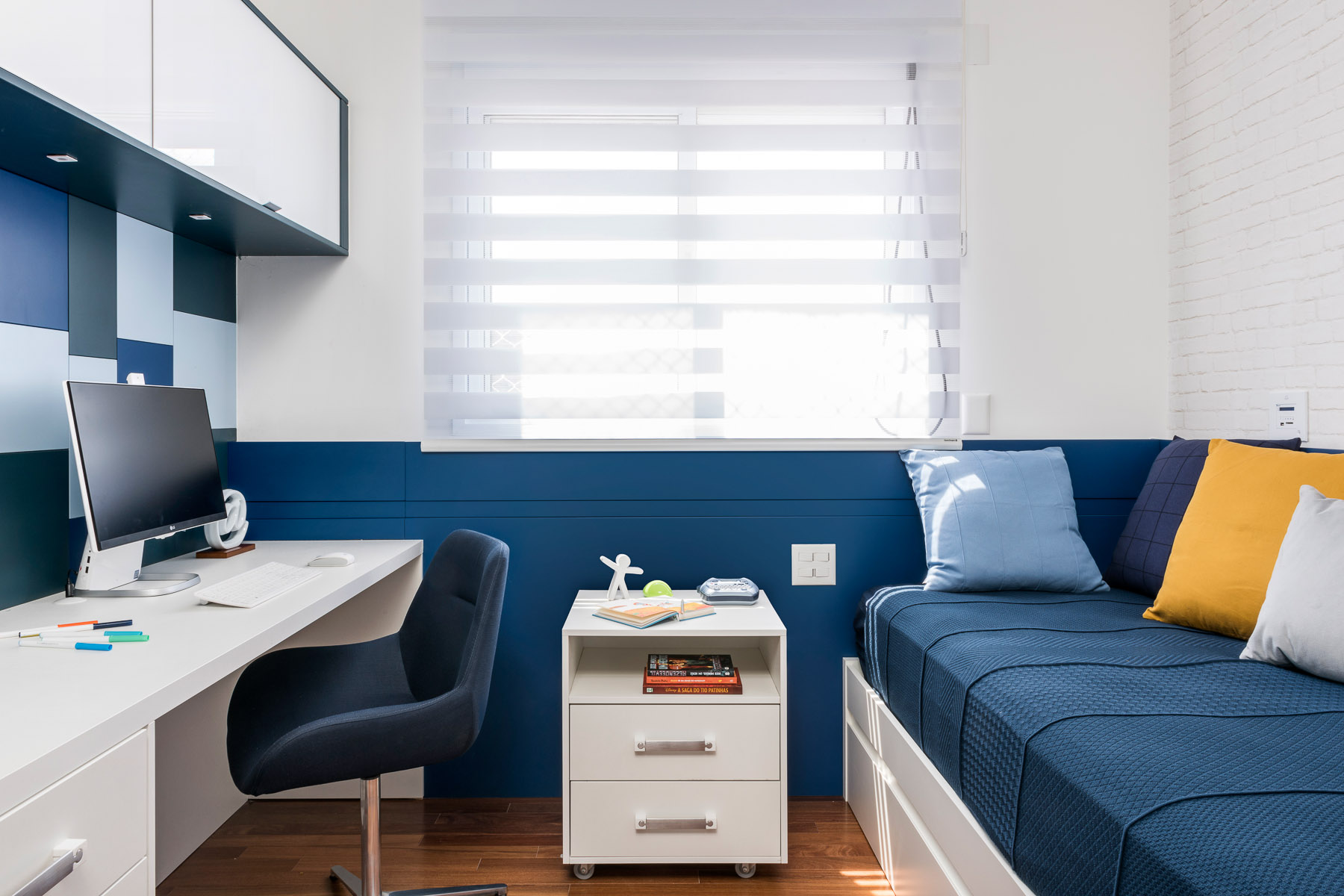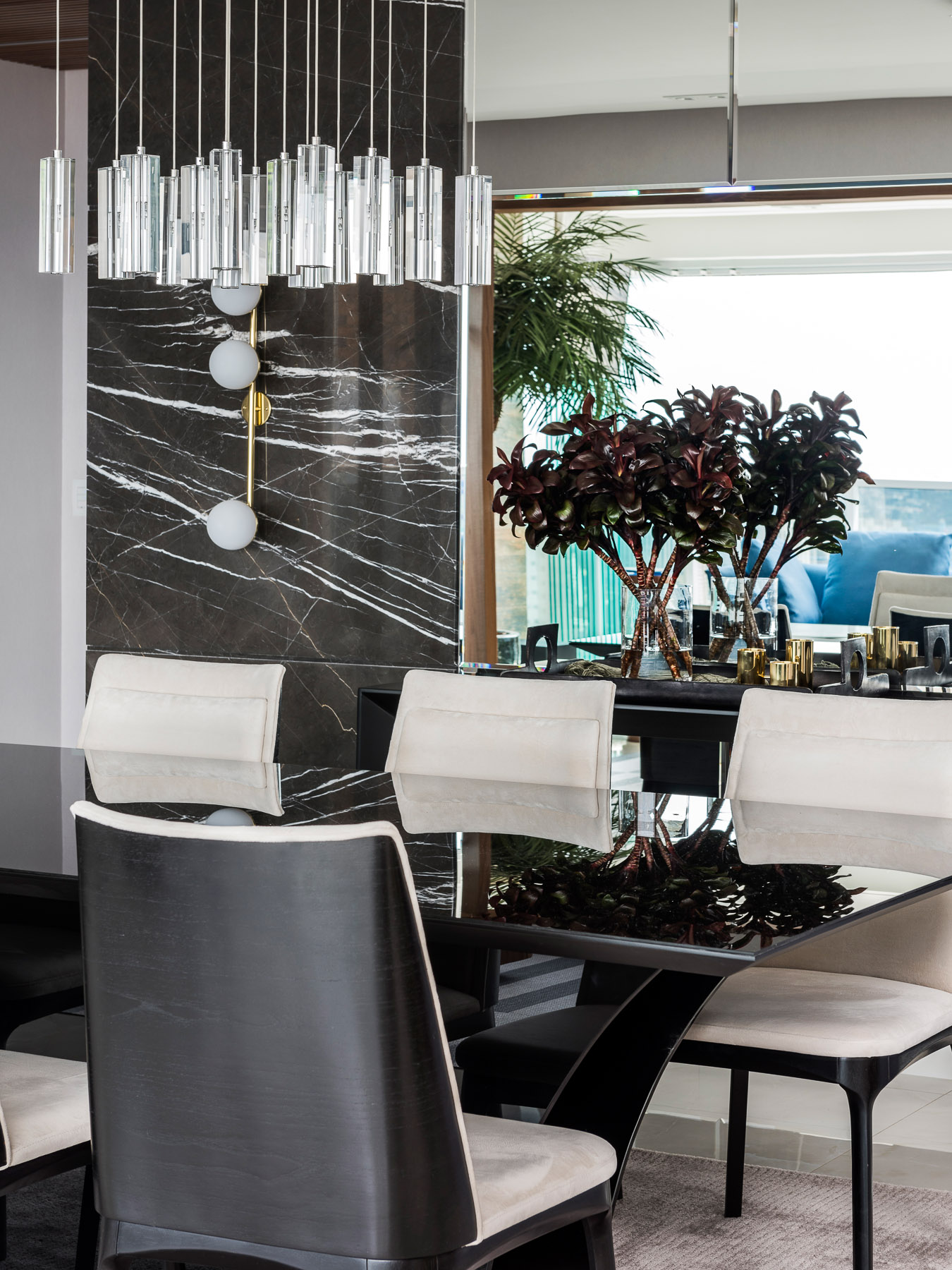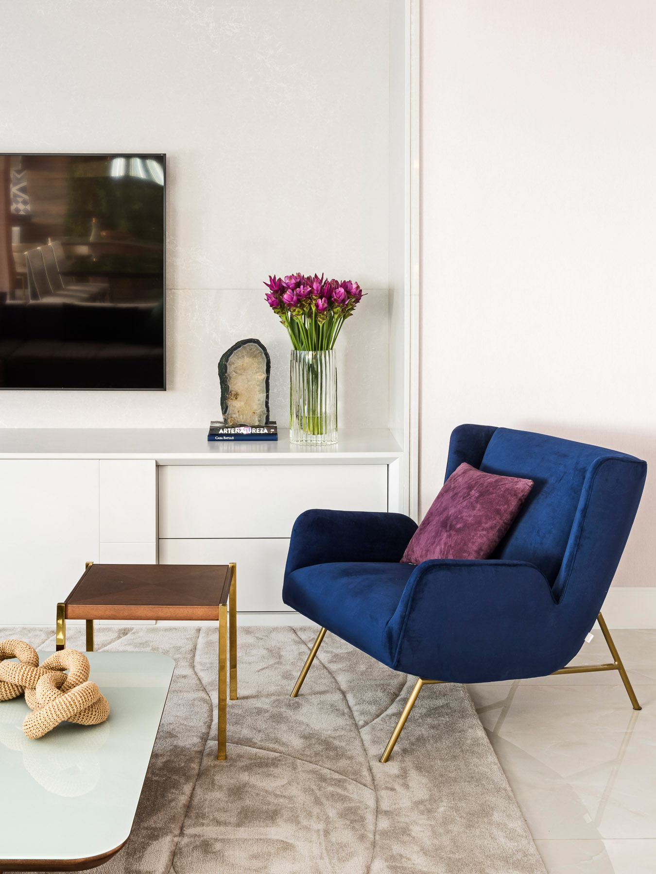 O projeto desse apartamento foi pensado para toda a família. O living é um dos principais ambientes do apartamento e foi projetado em tons neutros e claros em sua maioria, com toque de cor em alguns móveis e detalhes que trazem leveza e deixam o ambiente mais alegre. O terraço integrado ao living tem abundância em madeira nogueira tornando o ambiente sútil. O painel vertical com vegetação deixa o ambiente mais vivo.