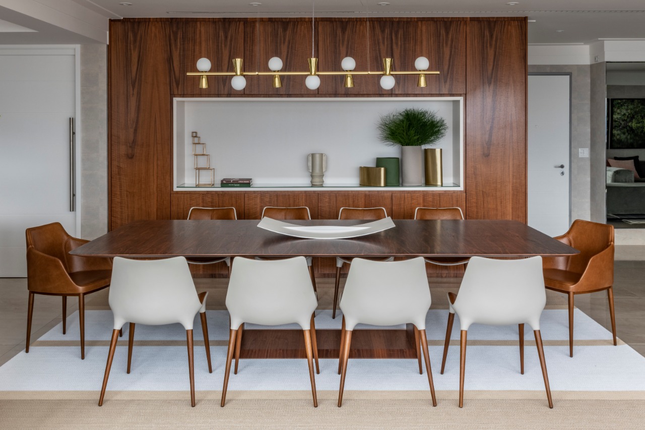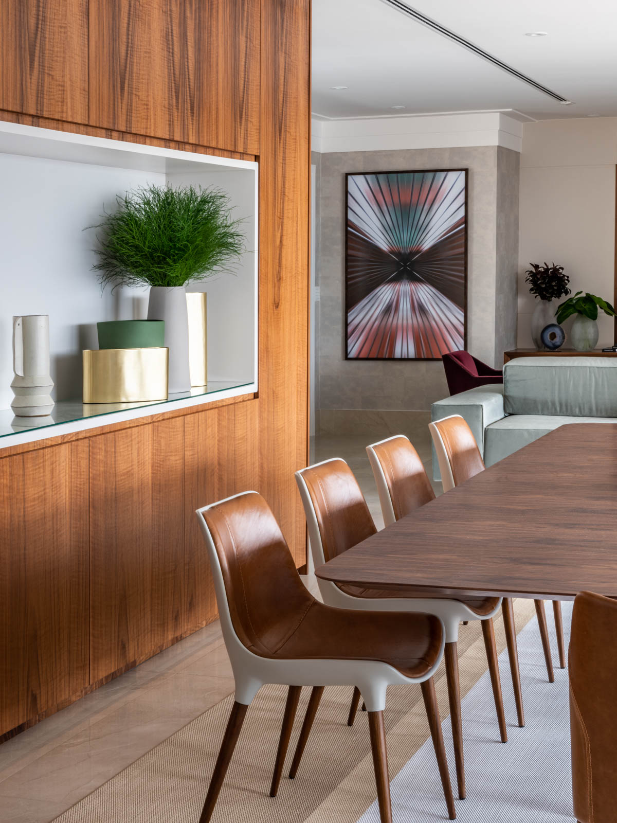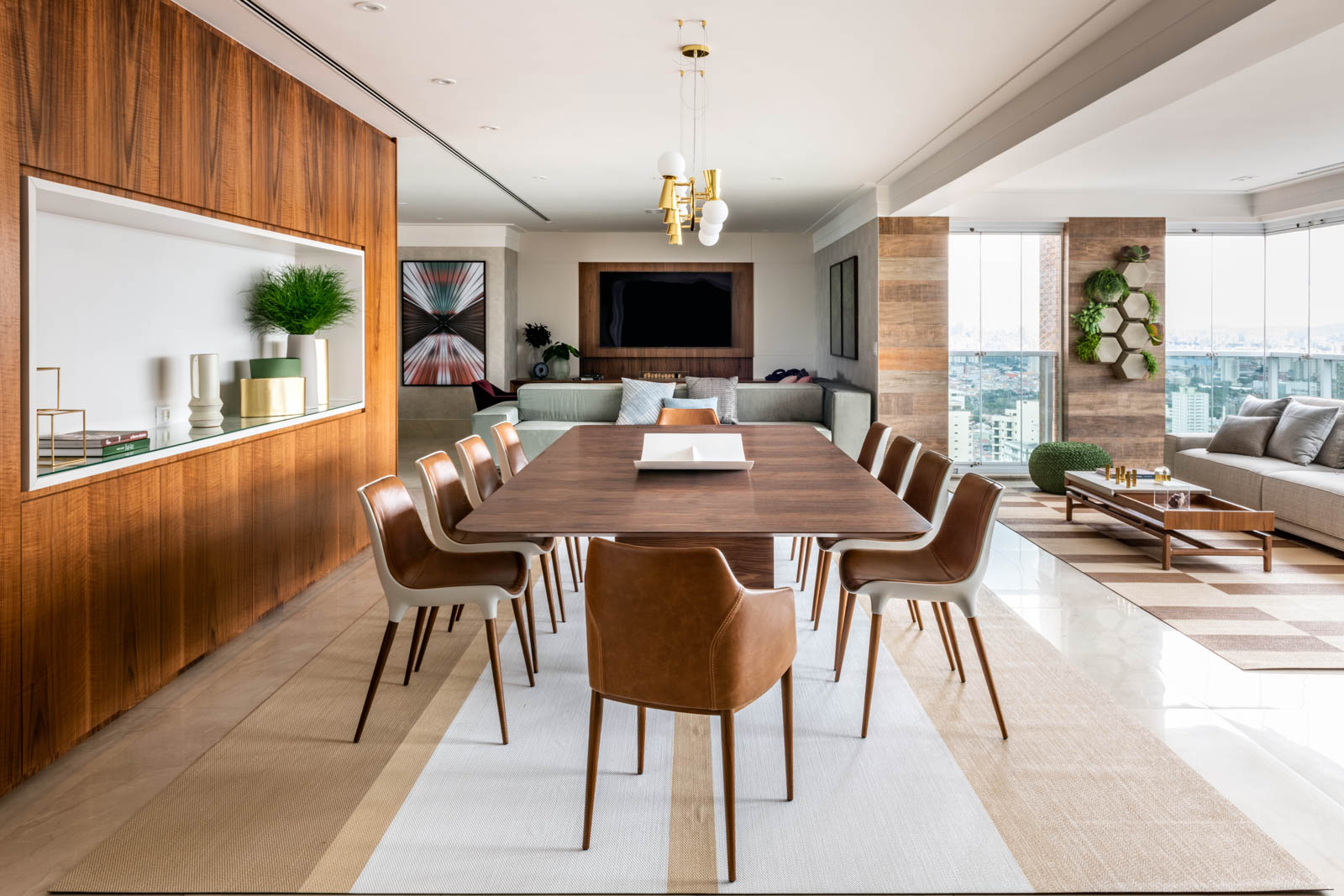 Neste projeto, localizado no Edifício Alhambra de Granada, a integração dos ambientes foi o ponto de partida para criar um lar acolhedor, funcional e ideal para reunir a família. A cliente, uma anfitriã nata, desejava um apartamento que privilegiasse os encontros de final de semana com suas três filhas e os netos — e cada detalhe foi pensado para isso. A área social do apartamento é marcada por uma imponente mesa de jantar para dez lugares, perfeita para momentos em família. Logo atrás, um móvel de apoio foi projetado para facilitar o serviço das refeições, com elegância e praticidade. O living se estende até o terraço gourmet, onde criamos um segundo espaço para refeições, com uma mesa de quatro lugares dedicada especialmente às crianças, garantindo que todos tivessem seu lugar à mesa. No quarto do casal, o pedido foi por um estilo mais clássico — e traduzimos esse desejo com o uso de boiseries nas paredes, criando um ambiente elegante, sereno e atemporal. O banheiro do casal, todo em branco, conta com uma banheira que convida ao relaxamento. O projeto também contempla um confortável quarto de hóspedes, pronto para acolher com charme e comodidade. Este apartamento é, acima de tudo, um espaço de encontros, afetos e boas memórias — exatamente como a cliente sonhou.