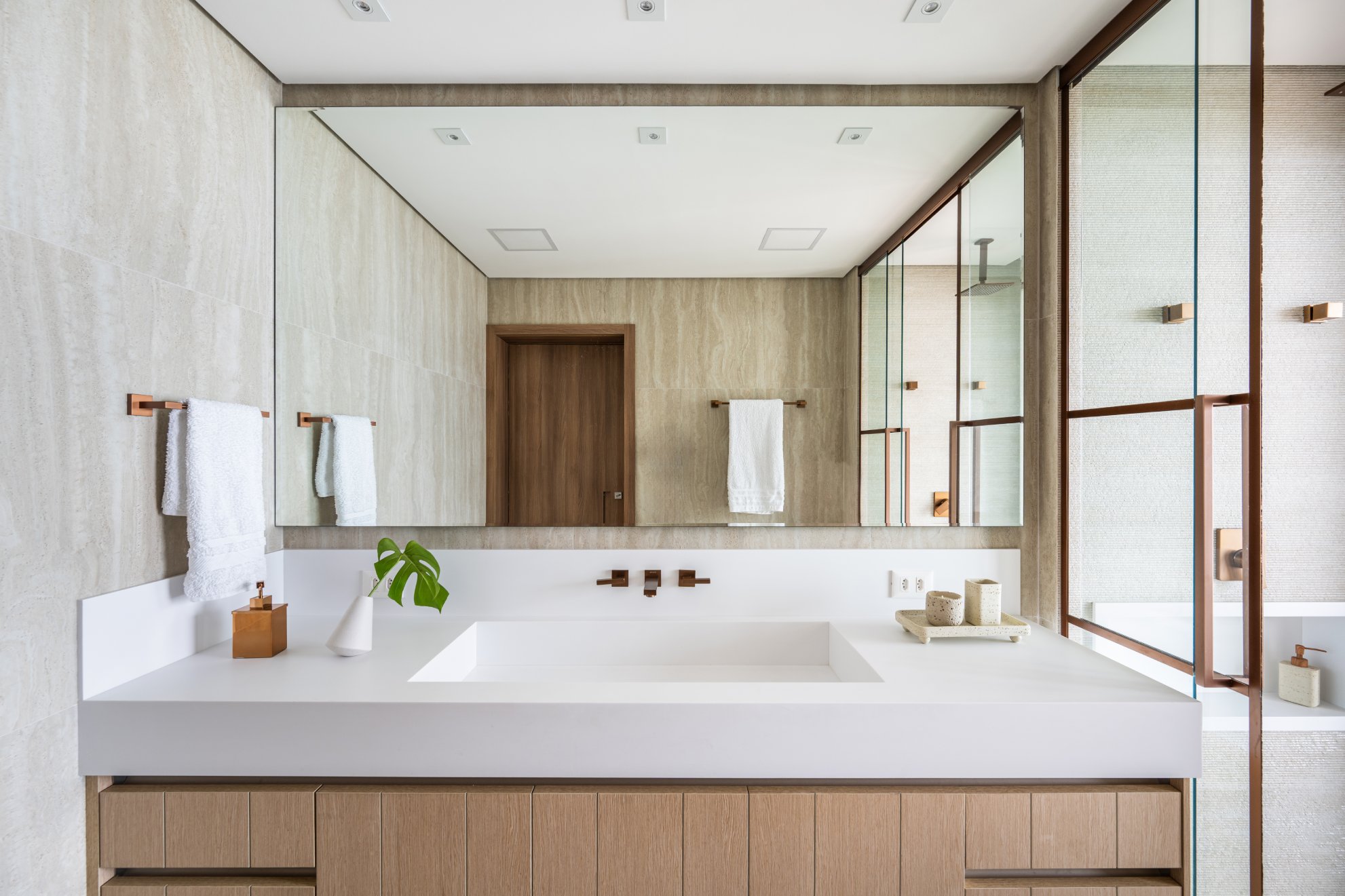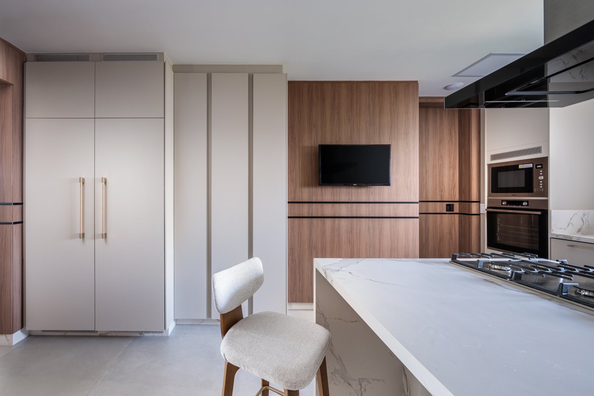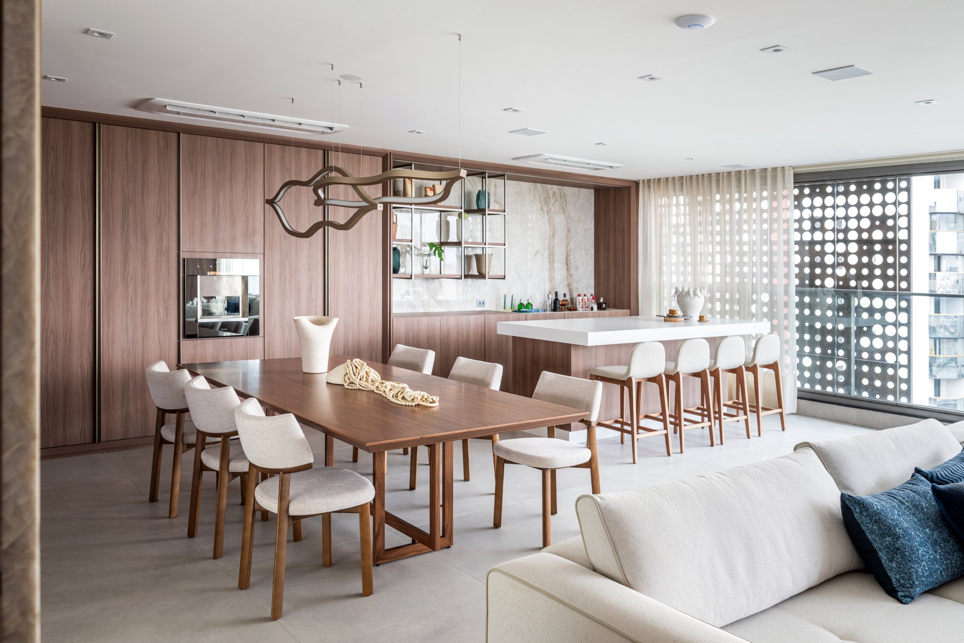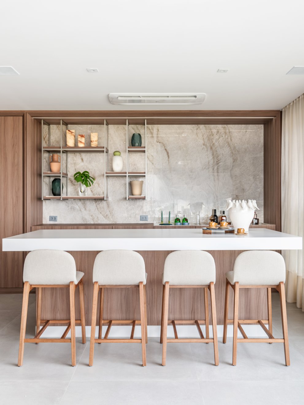 Neste projeto, a área social foi pensada como um único fluxo contínuo, com estar, jantar e espaço gourmet conversam entre si com naturalidade, sem excessos e sem interrupções visuais. A marcenaria em madeira aquece o ambiente e cria unidade. O painel da TV, desenhado em linhas limpas e com detalhe ripado, traz ritmo e leveza. O quartzo natural Taj Mahal aplicado em grandes planos funciona como obra de arte da natureza, valorizando a verticalidade e trazendo textura sem pesar. A paleta neutra, com areia, off-white e tons amadeirados, cria uma base atemporal. Os pontos de cor entram com intenção: o azul das almofadas, o vermelho das flores, o âmbar do vidro sobre a mesa de centro. Nada é aleatório. Tudo tem propósito. O bar, integrado ao painel em pedra, recebe iluminação indireta que destaca as garrafas e transforma o uso cotidiano em experiência. A ilha generosa reforça o convívio, enquanto as cadeiras em madeira e tecido claro mantêm a leveza visual. É um espaço pensado para viver , receber amigos, reunir a família, assistir a um filme com conforto e, ao mesmo tempo, contemplar cada detalhe. Alto padrão não está no excesso. Está na proporção, na escolha precisa dos materiais e na sensação que o ambiente entrega todos os dias. Nesta cozinha, o desenho parte da ideia de fluidez e organização visual. A composição em L otimiza circulação, enquanto a ilha com cooktop centraliza o preparo e transforma o ato de cozinhar em convivência. A marcenaria em tons claros mantém o ambiente leve, e os detalhes em madeira conectam com o restante da área social, garantindo coerência no projeto inteiro. Os eletros são embutidos e integrados ao volume da marcenaria, nada interrompe a leitura do espaço. O quarto foi pensado como um refúgio. A base neutra cria serenidade, enquanto o painel amadeirado traz calor e textura na medida exata. A marcenaria desenhada sob medida organiza e valoriza a parede da TV sem pesar. Linhas verticais alongam o espaço e reforçam a sensação de continuidade. A roupa de cama em tons claros recebe o verde como ponto de profundidade,sofisticado, elegante, nada óbvio. A obra de arte complementa a paleta com movimento e leveza. É o tipo de ambiente que desacelera o ritmo e convida ao descanso com personalidade.