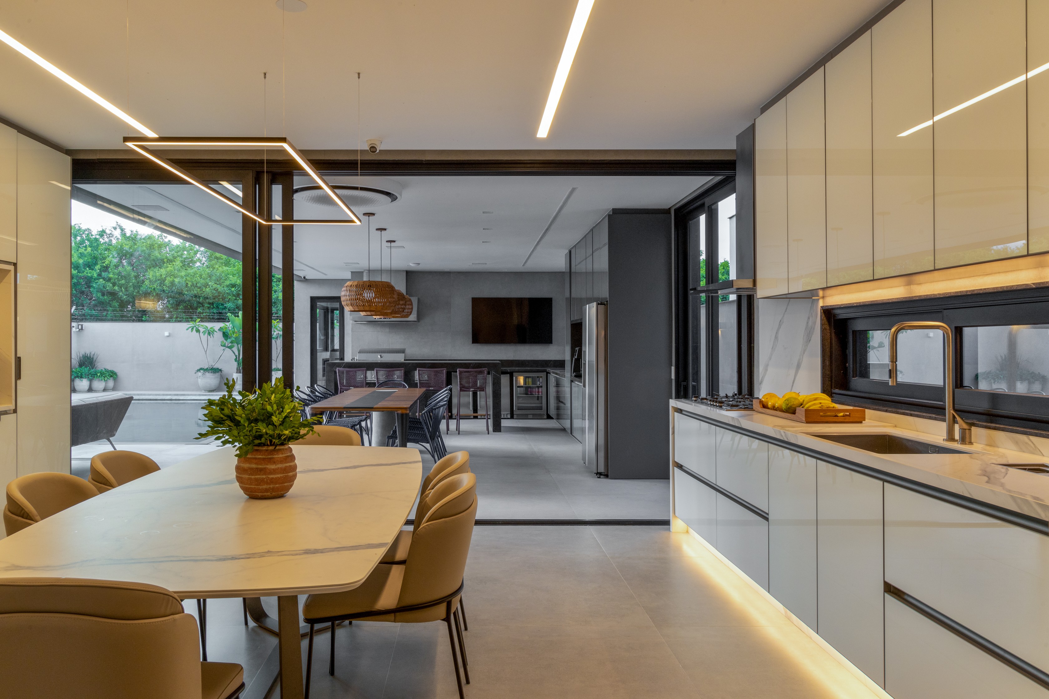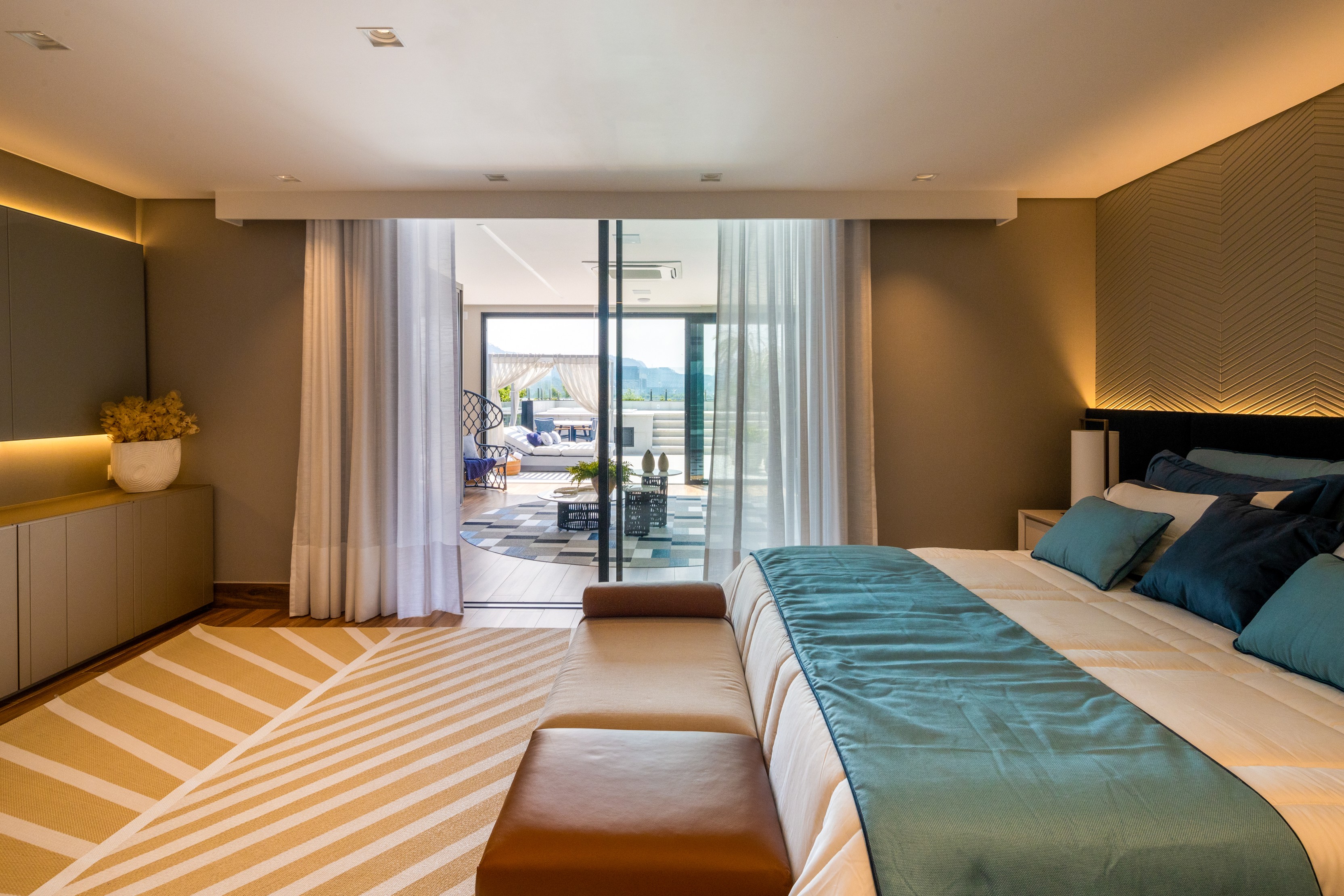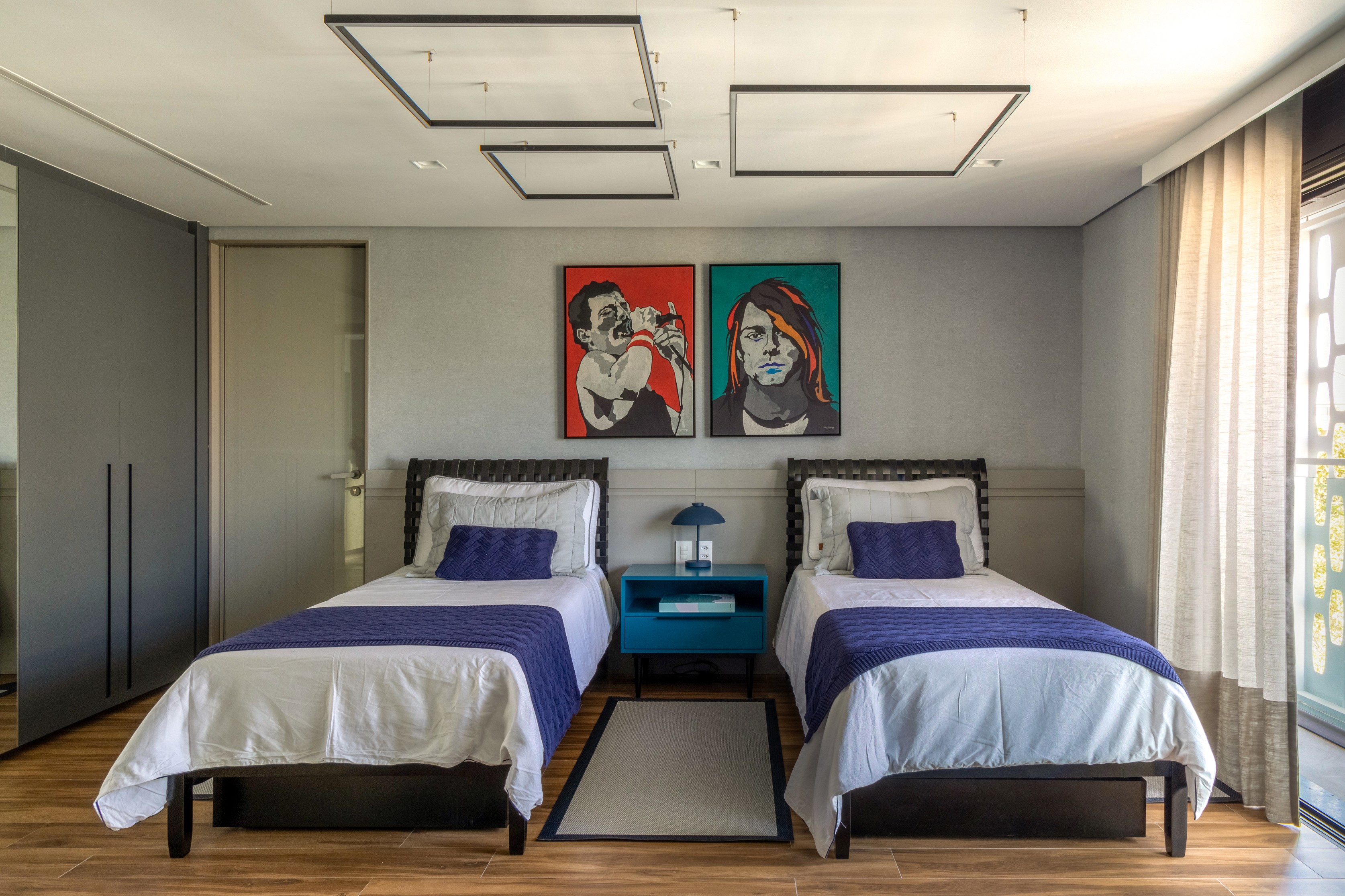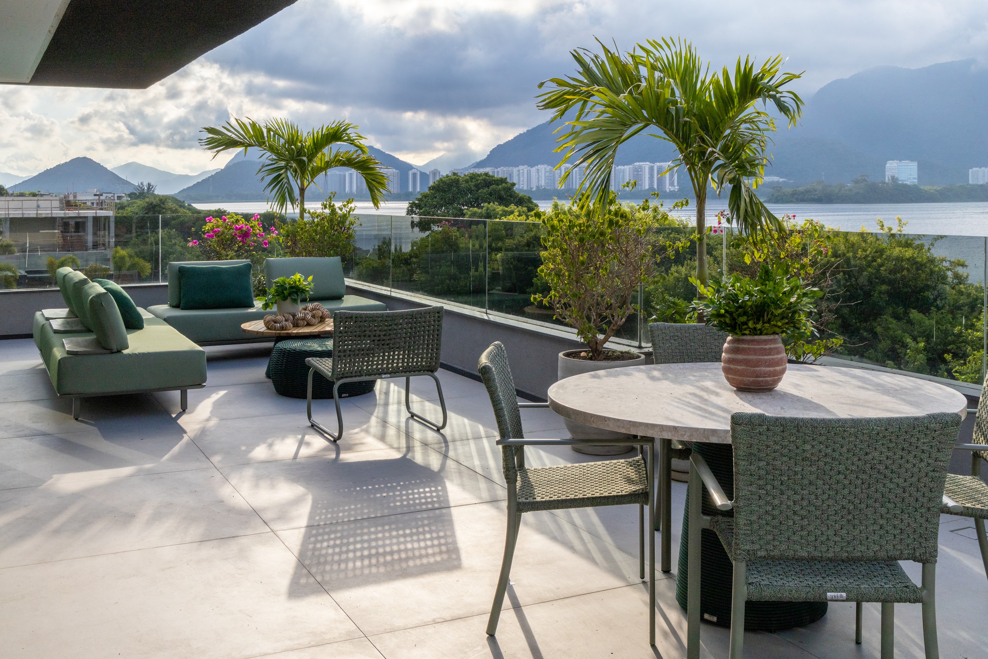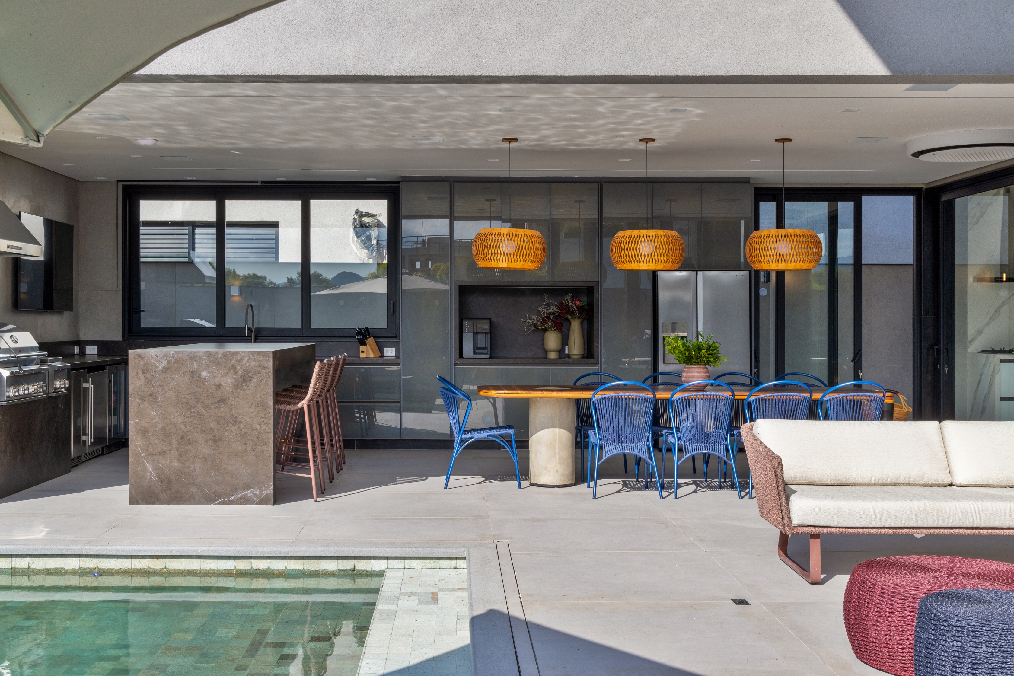 Tive o prazer de decorar esta casa de veraneio na Barra da Tijuca, no Rio de Janeiro, para uma cliente muito querida que reside em São Paulo. O pedido era claro: criar um lar acolhedor e funcional, com clima de férias, mas sem abrir mão da sofisticação. Na área externa, desenhei um ambiente perfeito para os momentos de lazer. A piscina, ponto central da casa, é abraçada por uma churrasqueira integrada e um mobiliário pensado para relaxar com estilo — tudo em perfeita harmonia com o paisagismo tropical ao redor. A cozinha foi desenvolvida com foco na praticidade. Totalmente branca, recebeu materiais tecnológicos que garantem durabilidade e facilidade no dia a dia, sem perder o frescor visual que combina com a proposta da casa. Na sala de estar, o pé-direito duplo proporciona imponência e amplitude. Apostei em um pendente escultural que se tornou protagonista no ambiente, além de um tapete em tons de azul que remete ao mar, conectando o interior ao cenário praiano. A sala de jantar, com uma paleta atemporal, se destaca pelos armários com nicho central em mármore Calacata, trazendo um toque de sofisticação e equilíbrio. O quarto do casal segue a mesma linguagem suave da casa, com tons claros e uma cabeceira em linho azul-marinho, evocando a brisa do mar em cada detalhe. Na varanda privativa, criamos um verdadeiro spa com hidromassagem e um bangalô para momentos de descanso e contemplação. O banheiro do casal foi desenhado com uma proposta minimalista e contemporânea: todo branco, com metais em preto fosco — um contraste elegante que resultou em um espaço clean e extremamente luxuoso. Para o quarto do filho, a ideia foi traduzir personalidade e versatilidade. Trabalhamos com duas camas de solteiro, permitindo receber amigos, e decoramos com quadros que homenageiam ícones do rock, como Freddie Mercury e Kurt Cobain, dando um ar moderno e descontraído ao ambiente. No rooftop, projetamos uma área com mobiliário verde em tecido tecnológico, resistente ao sol e à chuva, ideal para aproveitar a vista e relaxar ao ar livre em qualquer estação. O resultado é uma casa que traduz exatamente o espírito do Rio: leve, elegante, com alma praiana e momentos inesquecíveis ao lado de quem se ama.