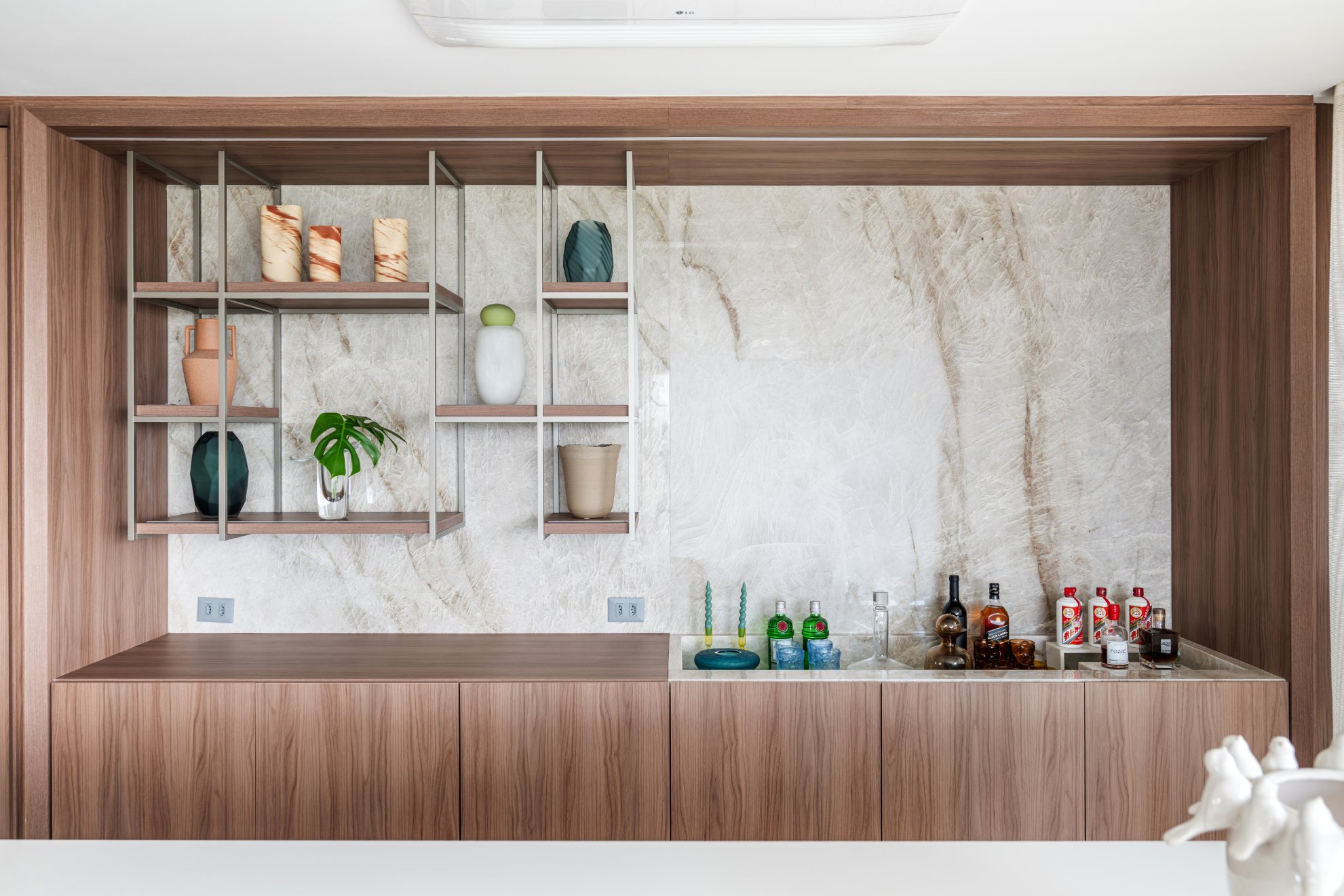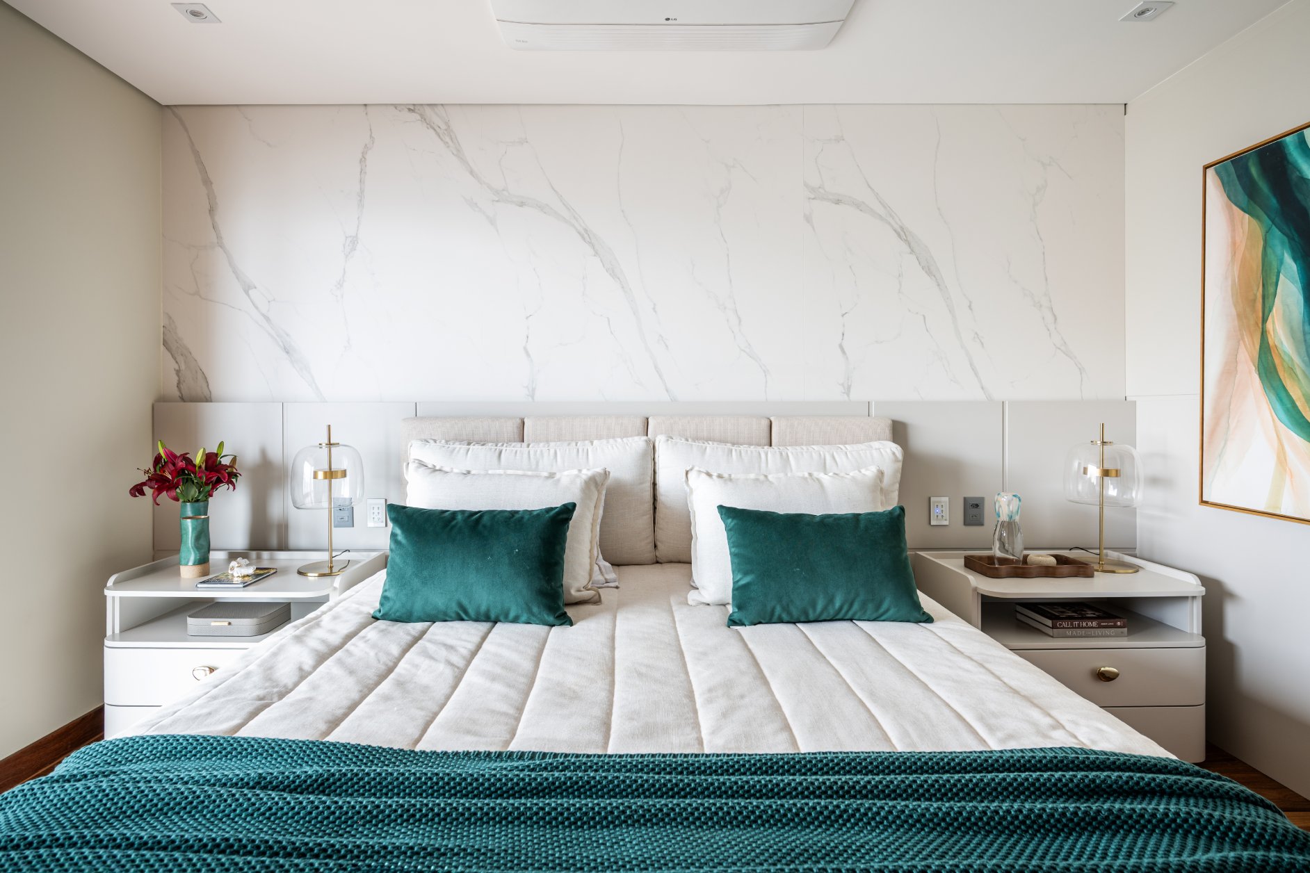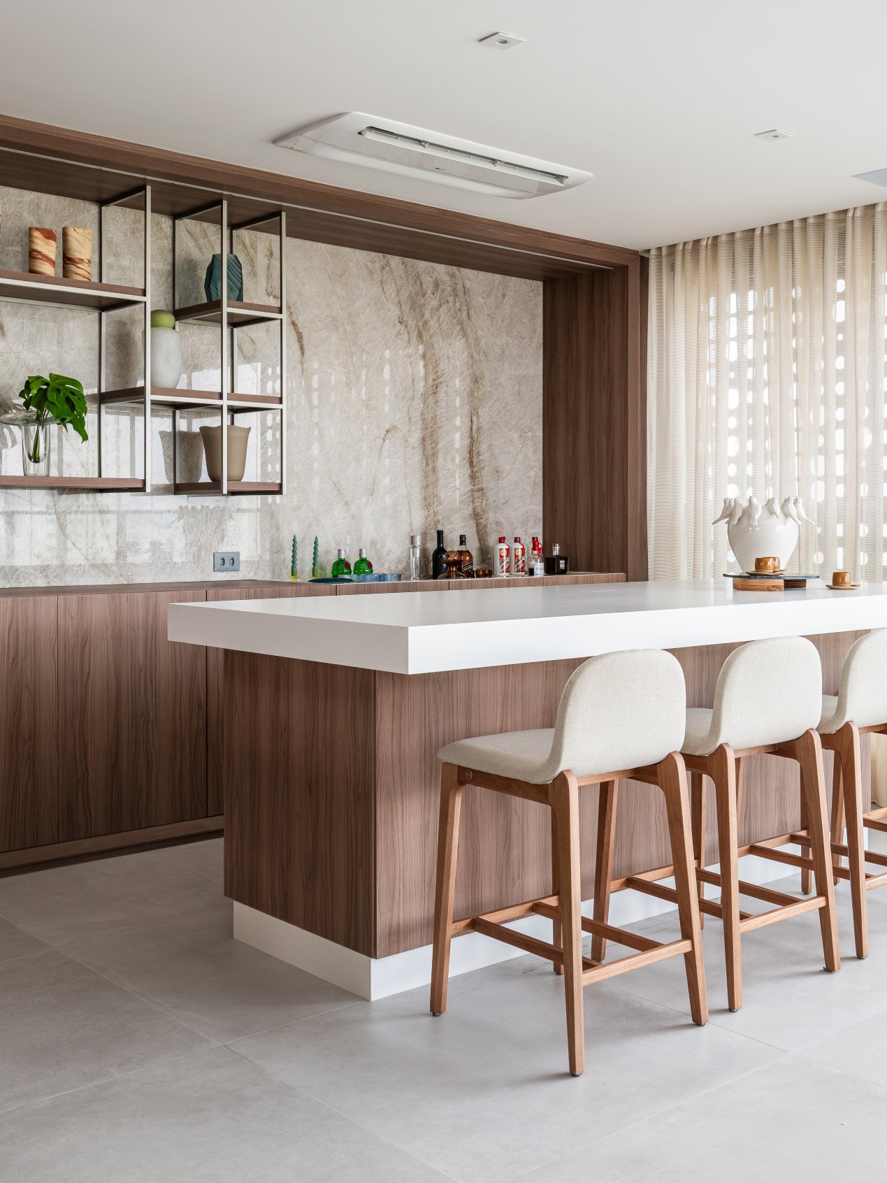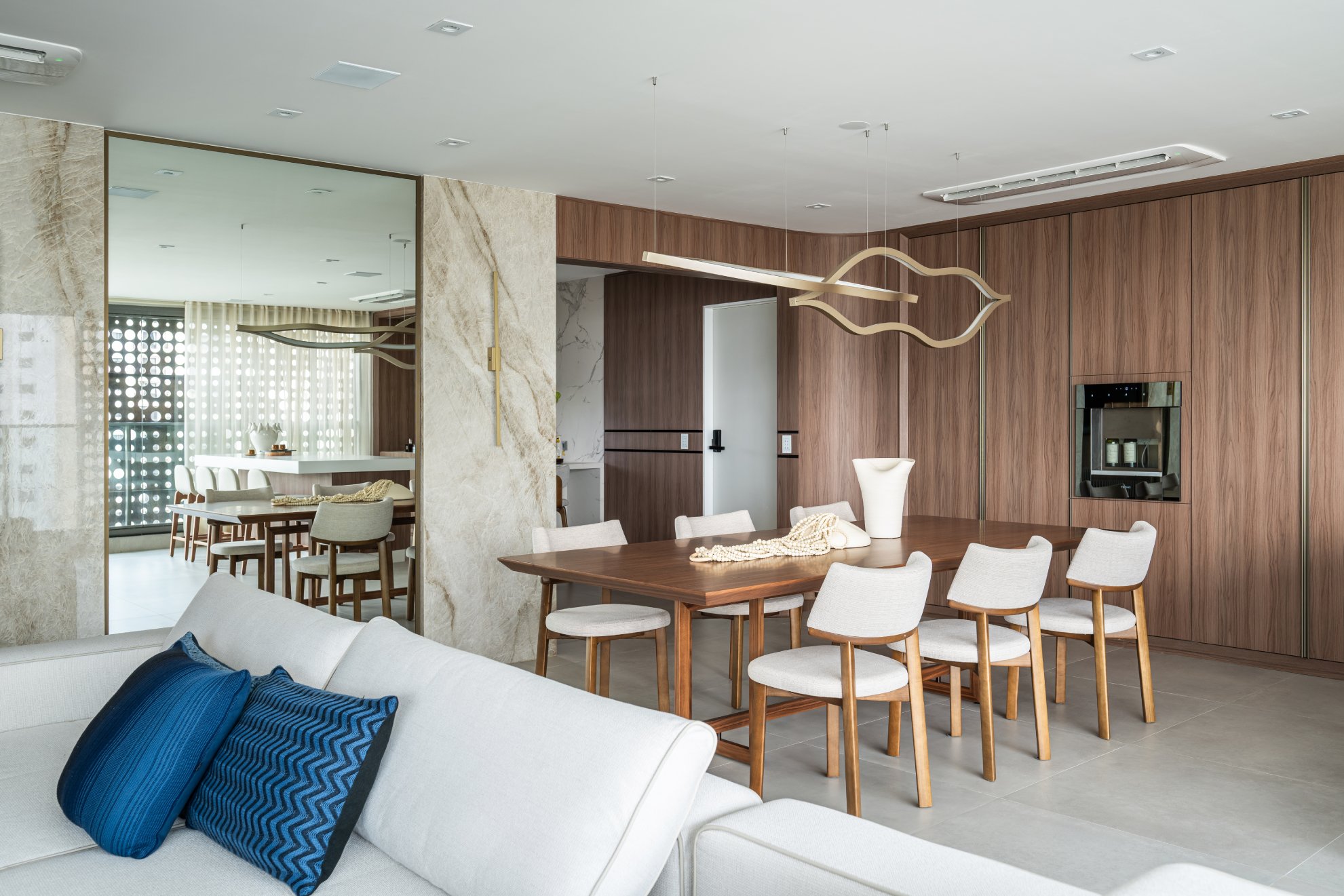 Neste projeto, a área social foi pensada como um único fluxo contínuo, com estar, jantar e espaço gourmet conversam entre si com naturalidade, sem excessos e sem interrupções visuais. A marcenaria em madeira aquece o ambiente e cria unidade. O painel da TV, desenhado em linhas limpas e com detalhe ripado, traz ritmo e leveza. O quartzo natural Taj Mahal aplicado em grandes planos funciona como obra de arte da natureza, valorizando a verticalidade e trazendo textura sem pesar. A paleta neutra, com areia, off-white e tons amadeirados, cria uma base atemporal. Os pontos de cor entram com intenção: o azul das almofadas, o vermelho das flores, o âmbar do vidro sobre a mesa de centro. Nada é aleatório. Tudo tem propósito. O bar, integrado ao painel em pedra, recebe iluminação indireta que destaca as garrafas e transforma o uso cotidiano em experiência. A ilha generosa reforça o convívio, enquanto as cadeiras em madeira e tecido claro mantêm a leveza visual. É um espaço pensado para viver , receber amigos, reunir a família, assistir a um filme com conforto e, ao mesmo tempo, contemplar cada detalhe. Alto padrão não está no excesso. Está na proporção, na escolha precisa dos materiais e na sensação que o ambiente entrega todos os dias. Nesta cozinha, o desenho parte da ideia de fluidez e organização visual. A composição em L otimiza circulação, enquanto a ilha com cooktop centraliza o preparo e transforma o ato de cozinhar em convivência. A marcenaria em tons claros mantém o ambiente leve, e os detalhes em madeira conectam com o restante da área social, garantindo coerência no projeto inteiro. Os eletros são embutidos e integrados ao volume da marcenaria, nada interrompe a leitura do espaço. O quarto foi pensado como um refúgio. A base neutra cria serenidade, enquanto o painel amadeirado traz calor e textura na medida exata. A marcenaria desenhada sob medida organiza e valoriza a parede da TV sem pesar. Linhas verticais alongam o espaço e reforçam a sensação de continuidade. A roupa de cama em tons claros recebe o verde como ponto de profundidade,sofisticado, elegante, nada óbvio. A obra de arte complementa a paleta com movimento e leveza. É o tipo de ambiente que desacelera o ritmo e convida ao descanso com personalidade.