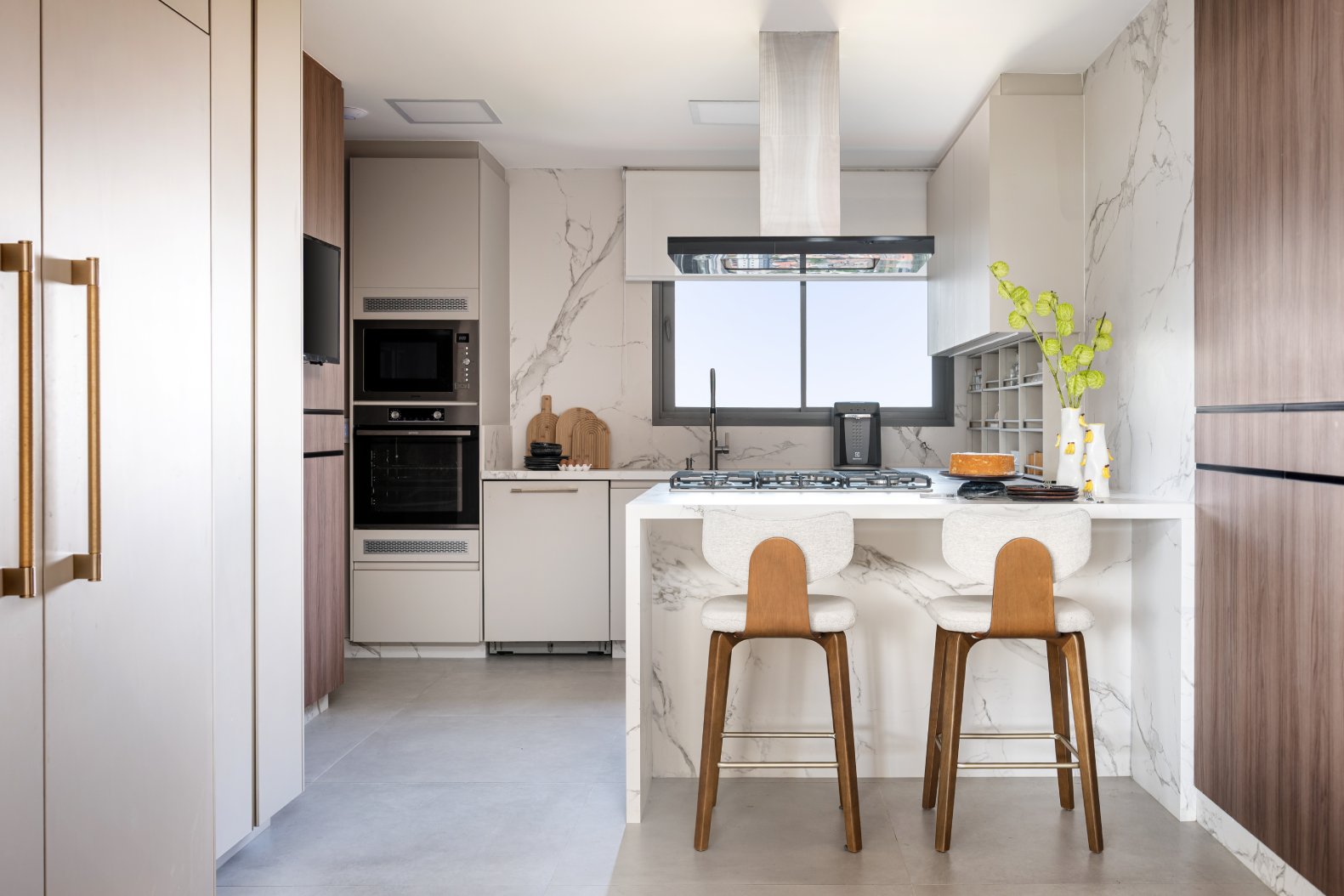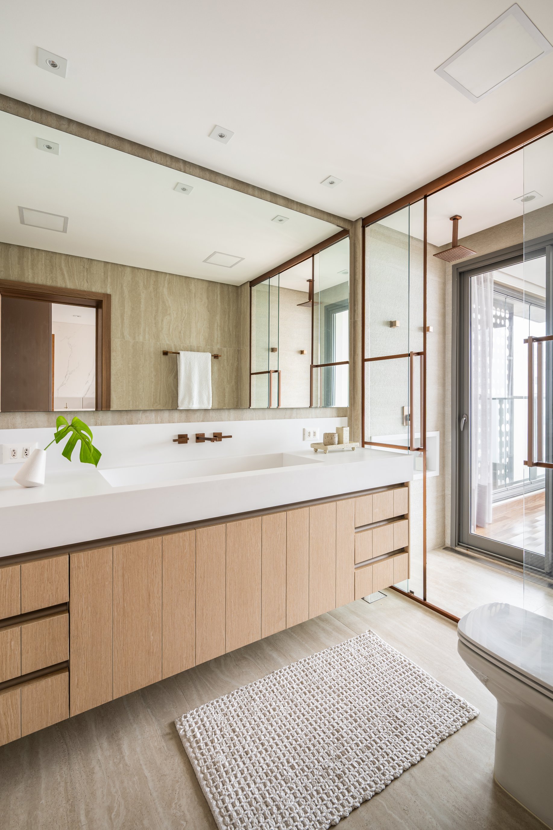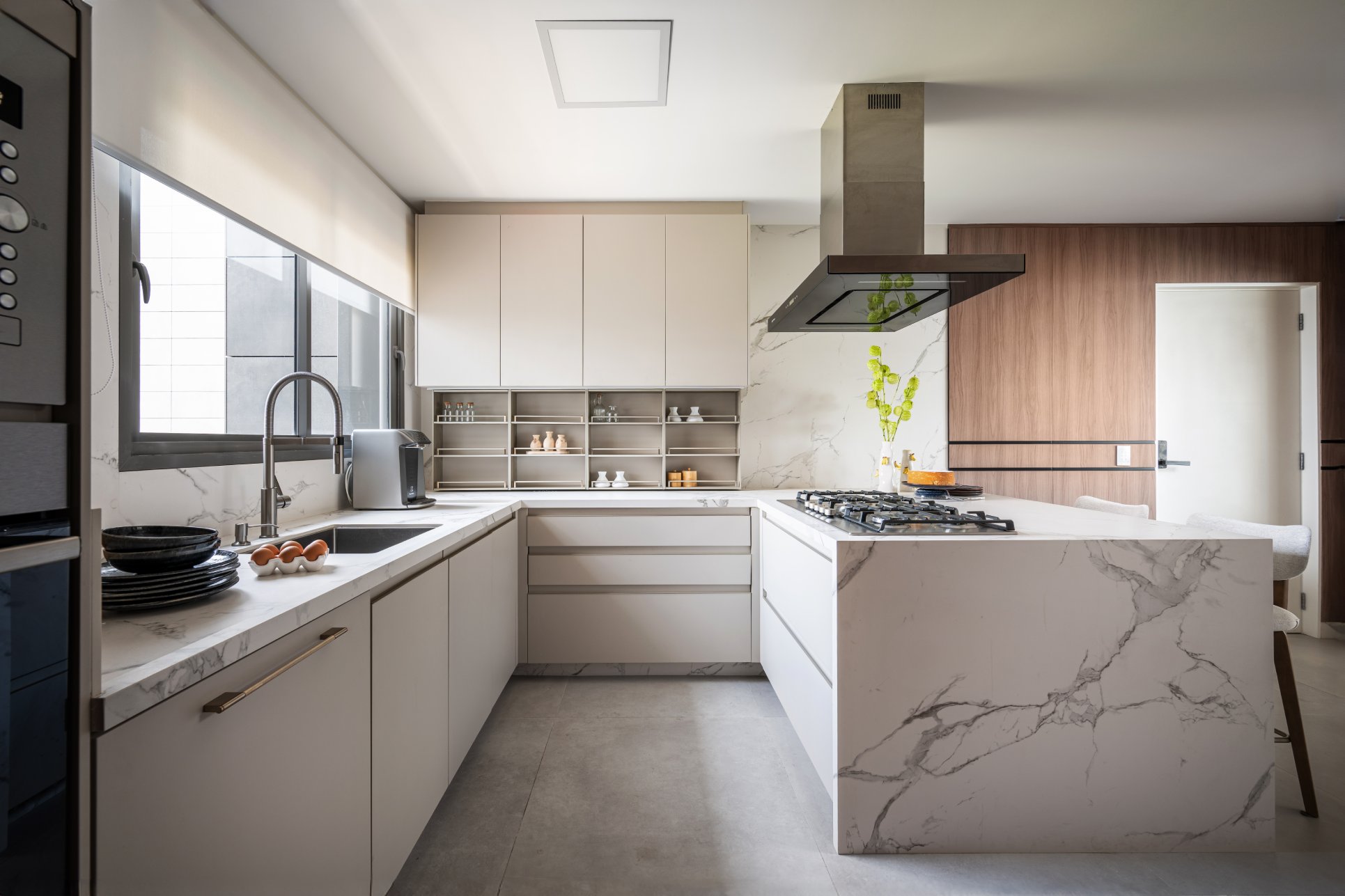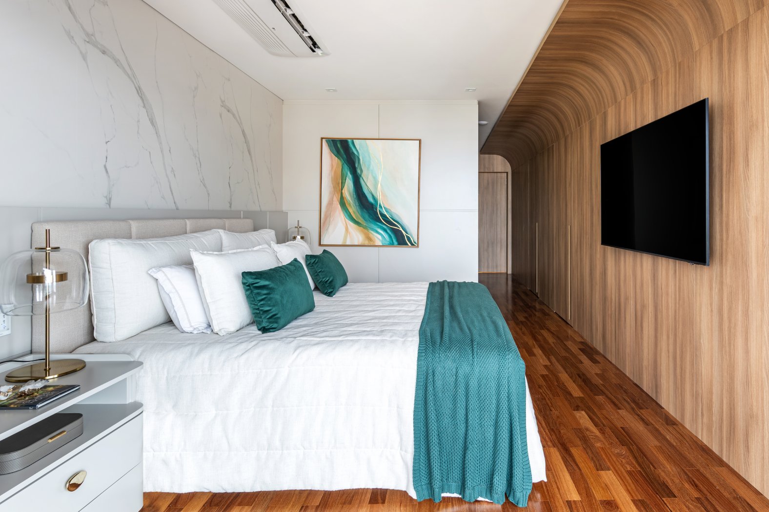 Neste projeto, a área social foi pensada como um único fluxo contínuo, com estar, jantar e espaço gourmet conversam entre si com naturalidade, sem excessos e sem interrupções visuais. A marcenaria em madeira aquece o ambiente e cria unidade. O painel da TV, desenhado em linhas limpas e com detalhe ripado, traz ritmo e leveza. O quartzo natural Taj Mahal aplicado em grandes planos funciona como obra de arte da natureza, valorizando a verticalidade e trazendo textura sem pesar. A paleta neutra, com areia, off-white e tons amadeirados, cria uma base atemporal. Os pontos de cor entram com intenção: o azul das almofadas, o vermelho das flores, o âmbar do vidro sobre a mesa de centro. Nada é aleatório. Tudo tem propósito. O bar, integrado ao painel em pedra, recebe iluminação indireta que destaca as garrafas e transforma o uso cotidiano em experiência. A ilha generosa reforça o convívio, enquanto as cadeiras em madeira e tecido claro mantêm a leveza visual. É um espaço pensado para viver , receber amigos, reunir a família, assistir a um filme com conforto e, ao mesmo tempo, contemplar cada detalhe. Alto padrão não está no excesso. Está na proporção, na escolha precisa dos materiais e na sensação que o ambiente entrega todos os dias. Nesta cozinha, o desenho parte da ideia de fluidez e organização visual. A composição em L otimiza circulação, enquanto a ilha com cooktop centraliza o preparo e transforma o ato de cozinhar em convivência. A marcenaria em tons claros mantém o ambiente leve, e os detalhes em madeira conectam com o restante da área social, garantindo coerência no projeto inteiro. Os eletros são embutidos e integrados ao volume da marcenaria, nada interrompe a leitura do espaço. O quarto foi pensado como um refúgio. A base neutra cria serenidade, enquanto o painel amadeirado traz calor e textura na medida exata. A marcenaria desenhada sob medida organiza e valoriza a parede da TV sem pesar. Linhas verticais alongam o espaço e reforçam a sensação de continuidade. A roupa de cama em tons claros recebe o verde como ponto de profundidade,sofisticado, elegante, nada óbvio. A obra de arte complementa a paleta com movimento e leveza. É o tipo de ambiente que desacelera o ritmo e convida ao descanso com personalidade.